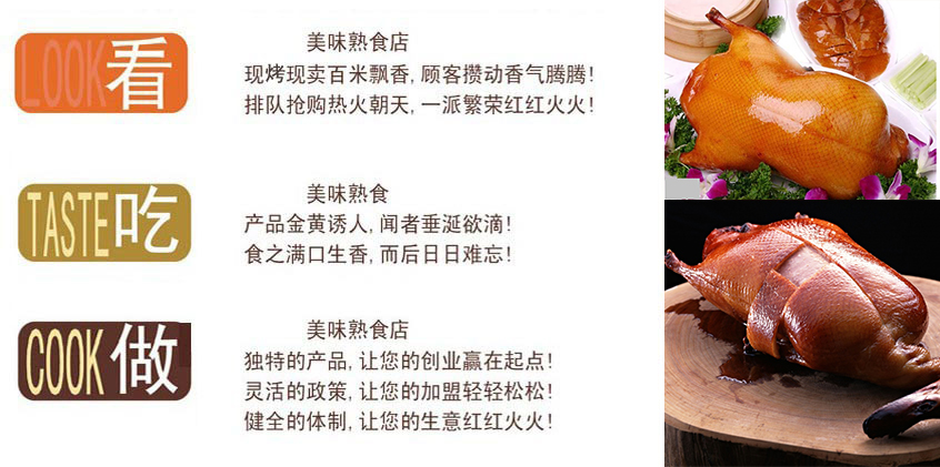 3.北京烤鴨能根據(jù)不同的地域改變口味嗎? 答:北京烤鴨品牌店的口味是不能隨意改變和調(diào)配的,如果改變了口味,它就不是北京烤鴨品牌店,就失去了北京烤鴨的特點特色,也就成了百店百個樣,千店千個樣,那么你加盟北京烤鴨品牌店也就失去了任何意義。
