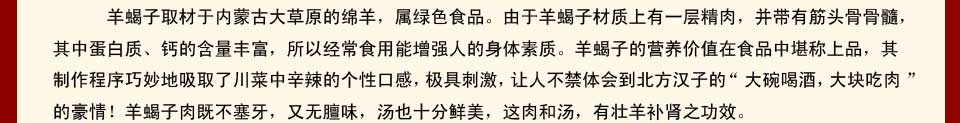 “羊蝎子火鍋來(lái)歷” 羊大梁,因其形似蝎子,故而老北京人俗稱(chēng)羊蝎子。選自羊之精髓,又稱(chēng)肉中黃金。以其為原料的羊蝎子火鍋在我國(guó)首都北京周?chē)延腥儆嗄隁v史,原見(jiàn)于皇宮貴族的一道美菜,后傳入民間。 羊蝎子主要原料采用羊身上營(yíng)養(yǎng)最豐富、口感最鮮美的羊龍骨,配以多種純天然中藥材調(diào)料,科學(xué)的調(diào)配中藥滋補(bǔ)配方,經(jīng)泡、挑、燒、煨、燜等十幾道工序秘制而成,使其營(yíng)養(yǎng)與保健同源。春可清內(nèi)熱,夏可消暑,秋能聚斂,冬行溫補(bǔ)之效,堪稱(chēng)老少皆宜,四季皆享的上乘養(yǎng)身健腦的佳肴。經(jīng)眾多京城白領(lǐng)、南北商旅人士食后公認(rèn)濃淡相宜,口齒留香,百吃不膩,流連往返。 食其肉:嫩而香,性味甘溫,補(bǔ)中益氣,還可促進(jìn)血液循環(huán)。 吸其髓:味甘性溫,養(yǎng)血益髓,富含鈣質(zhì),易于吸收。 品其湯:湯香滿(mǎn)堂,通透鮮美,回味綿長(zhǎng)。 經(jīng)幾年的推廣及新老顧客的口碑傳遞, 匯鑫騰翔(北京)國(guó)際餐飲管理有限公司的特別秘制工藝被多家羊蝎子火鍋名店所采用,在京城已是遍地開(kāi)花,甚是火爆。因此大江南北諸多城市精明的餐飲業(yè)者紛紛不遠(yuǎn)千里赴京加盟。成為當(dāng)前餐飲業(yè)的一朵奇葩。 原料選于內(nèi)蒙古大草原。是全國(guó)以放牧為養(yǎng)殖方法的唯一基地。優(yōu)美絕倫的天然大草原生態(tài)環(huán)境繁育了最好的羔綿羊,肉嫩、味美、色鮮、口感好,造就了羊蝎子的非凡品質(zhì),樹(shù)立了良好的口碑。 |